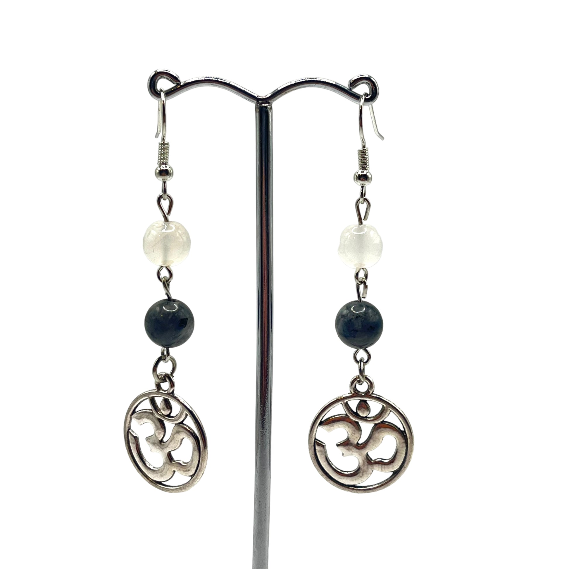 Oorbellen labradoriet/witte agaat met Ohm